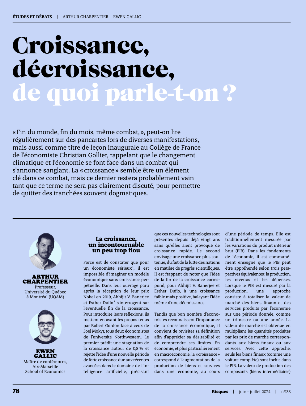 Notre billet sur la croissance économique rédigé avec Arthur Charpentier a été mis en forme dans le revue Risques.